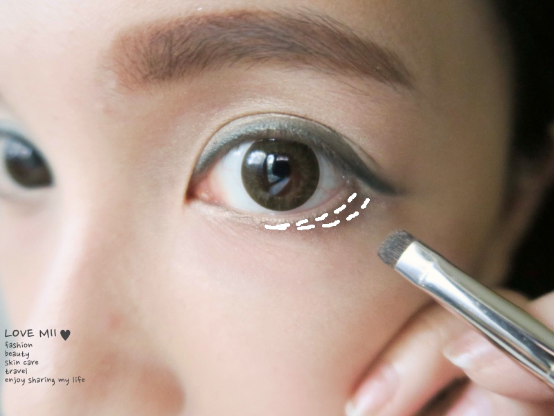 用較小體積刷頭(或5號眼影棒)沾取5號眼影描繪下眼線